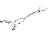 This 3" diameter Cat-Back(tm) system is intended for vehicles with significant performance upgrades. It includes a merge X-Pipe for increased performance and improved sound. This system has the classic S-Type sound with no drone inside the vehicle. Each muffler assembly has unique single 4.5" round carbon fiber with bright center tips. Borla(r) Cat-Back(tm) & Axle-Back exhaust systems feature patented straight-through and multi-core technology to unleash hidden horsepower. Increased exhaust velocity adds power, driving excitement, fuel economy, and the distinctive Borla(r) Sound of Power respected by motoring enthusiasts everywhere. Each system is built from premium T-304 austenitic stainless steel, superior to T-400 series knockoffs (such as 409), to give you the absolute best in performance and durability. Ultra-smooth mandrel bends ensure maximum flow & power, and precision computer numerical control (CNC) manufacturing ensures an accurate fit. Best of all, Borla(r) stands behind every system with a Million-Mile Warranty. Just what you'd expect from the world's most experienced (and most winning) exhaust brand.